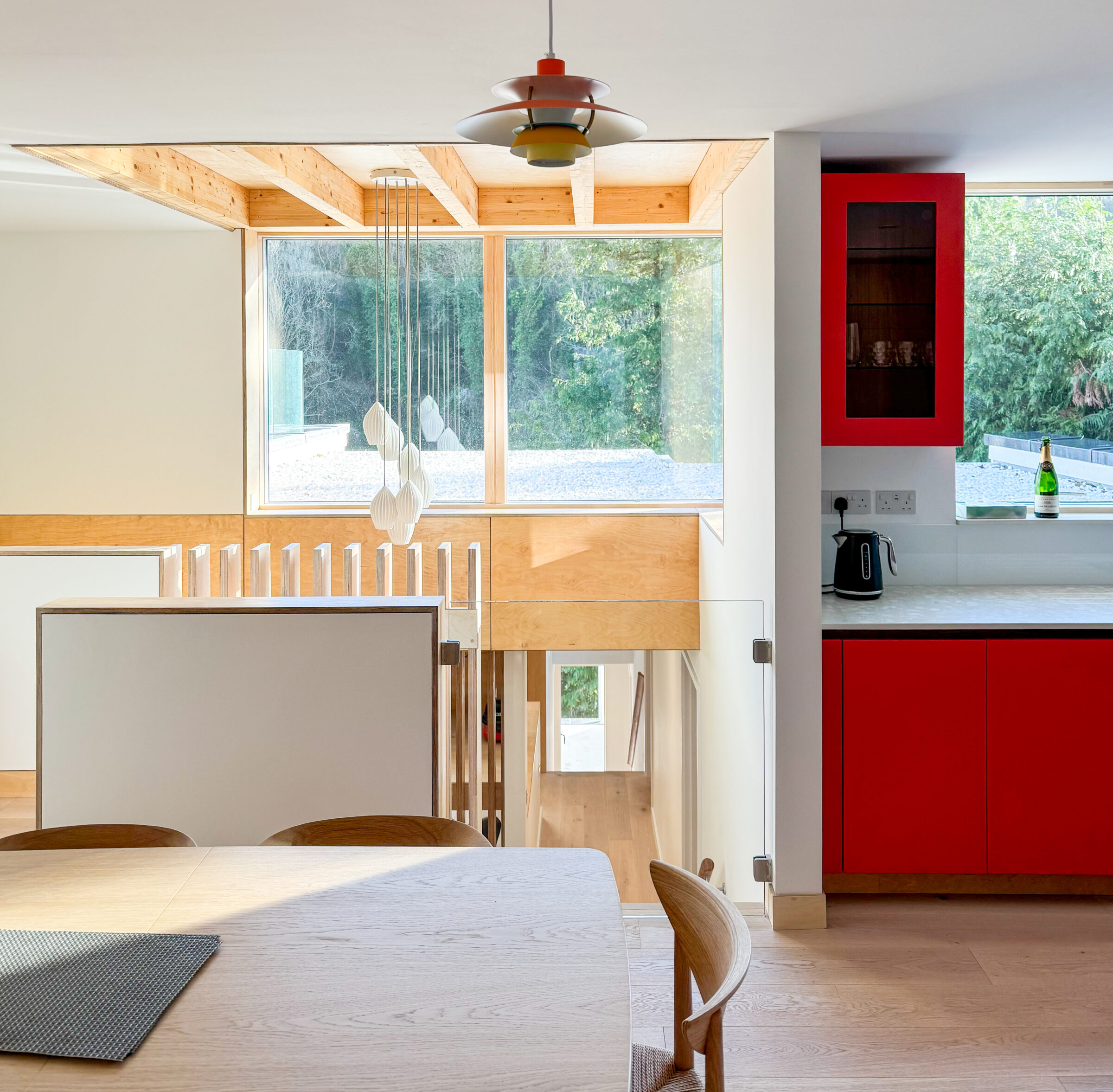 As architects in the South Hams, we are often involved in reimagining traditional barns and previously converted buildings. This contemporary addition transforms the layout of an existing compact dwelling, creating a vaulted ply lined entrance with a feature staircase, broken plan reception spaces and a new master suite at first floor.